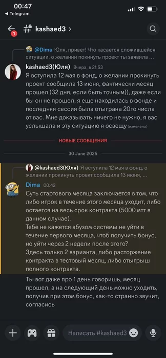 та нет ничего в договоре, если что-то было, то уже давно написали, они шлют всем сообщения в телеге, что вступи в их фонд и получи гарантированную выплату после месяца игры, но они не учли, что кто-то может уйти на втором месяце игры, хотя в контракте у них написано, что первый пакет должен отыгрываться полностью и уйти можно только в течении первого месяца,, кажись все логично подумали они, зачем прописывать еще условия, но на деле они обычно сами отпускают игроков, если нет мейка, вот и получилась такая ситуация, по факту они отпустили игрока уже после пробного периода, фонд явно облажался, но признавать они этого не хотят.