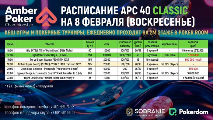 Начиная с февральской серии и до ноябрьской включительно, будут начисляться рейтинговые очки за ITM в турнирах Amber Poker Championship.