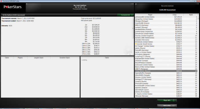 ДЕНЬ 27. В омаху сыграл всего два турнира и оба без денег. Но вчера был супервоскресенье, поэтому было не до омахи Сыграл 9 турниров в холдем, в том числе и 5-ти миллионный сандик Ламборджини выиграть так и не удалось, но прошел очень далеко и занял 85 место из 60К человек, выиграв 6,9К. Много людей болело в чате, в аське и на стретеджи, всё таки турнир особенный. Но с 85 местом поздравлять как то не логично. Поэтому, скажу всем спасибо за поддержку, но я больше расстроен, чем рад Дальше. Я очень далеко прошел в турнире за 55$, 100К гарантия, но предфиналка не сложилась и я вылетел