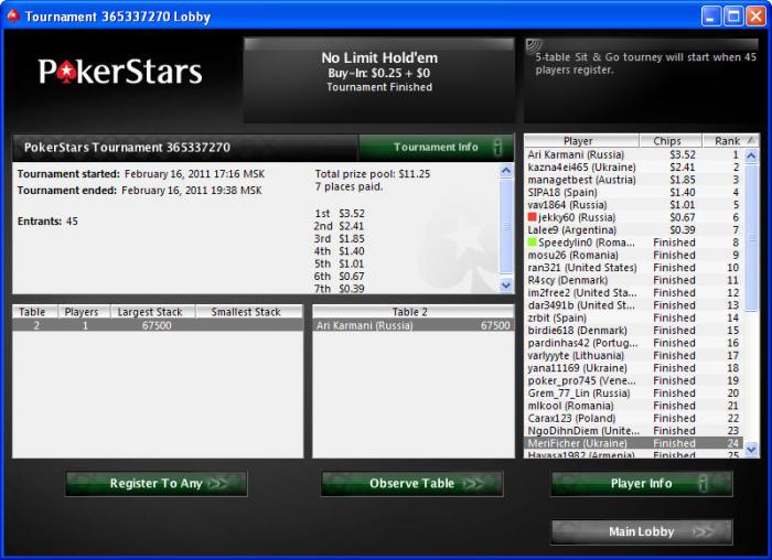 Poker Stars $0.25+$0.00 No Limit Hold'em Tournament - t1500/t3000 Blinds + t150 - 2 players