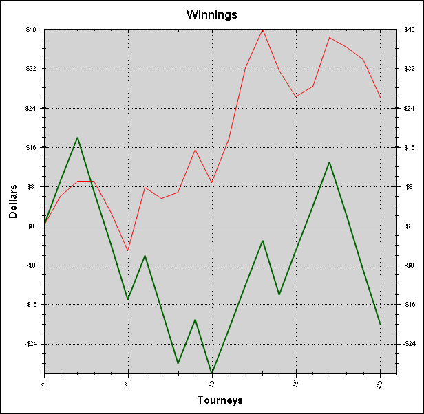 Сегодня попробовал вернуться к игре. До этого несколько дней спал по 13-15 часов, играл совсем мало. Сыграно 20 штук, результат 10:10. Судя по всему, по такой динамике, как у меня играть мне надо чудовищно много, чтобы иметь плюс не в электрических, а в реальных деньгах. Есть много ошибок, конечно, есть много непонятного, но есть моменты, когда я себя даже подставкой под карты не ощущаю, настолько безнадежно. В середине, открыл ХМ, посмотрел на график, хотел бросить игру, так расстроился — ни одной сессии без недобора нет... Например, проиграл четыре матча врагам, которые чудовищно овербетили весь матч: 5-6ББ префлоп и 3-4 пота постфлоп. Даже с такими идиотами — без шансов. Последние три проиграл так, словно играл с оппонентом не с десяток, а с сотен: стек начинал уменьшаться сразу же и до нуля, по ходу проигрывая любые банки. Не нравятся мне такие повороты событий.