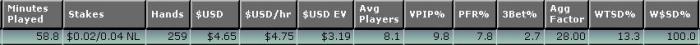 Лимит принял меня не очень хорошо, почти в самом начале опп с VPIP 46 убил на ривере моих со своими . Ну ничего, бывает. Хотя настроение слегка упало. На протяжении 590 рук я сделал 2 серьёзные ошибки и несколько мелких, которые привели меня к результату в -7,67. Я посчитал, что при нормальной игре, без этих ошибок, даже с переездом КК я заработал бы 3,21$. Но увы... ошибки в моей игре всё ещё присутствуют и как следствие - я проигрываю деньги. Сегодня думаю сделать ещё одну вылазку на NL4, бакнкролл 60$, PP должны дать 3,50 $ по бонусу совсем скоро, чувствую я себя довольно уверенно, постараюсь играть лучше и думаю, что всё получится