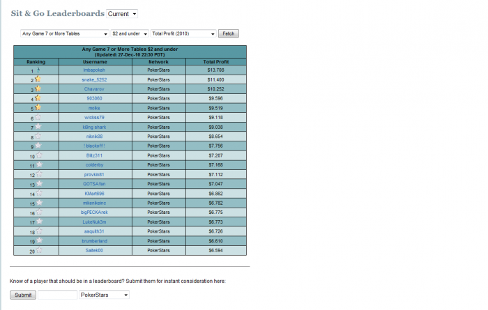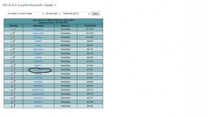 Поднялся ещё на строчку вверх. От десятой строчки меня отделяет одно место,а если учесть,что рег который её занимает в основном теперь катает 3+р,то мне завтра необходимо плюсануть на 60$.
