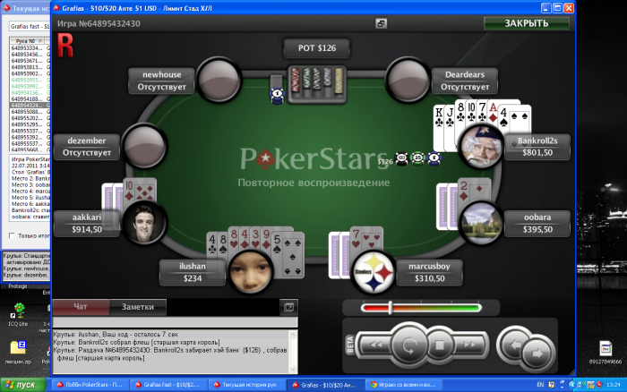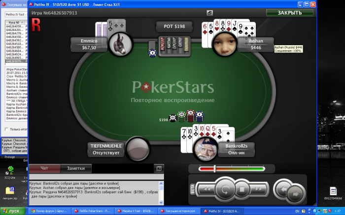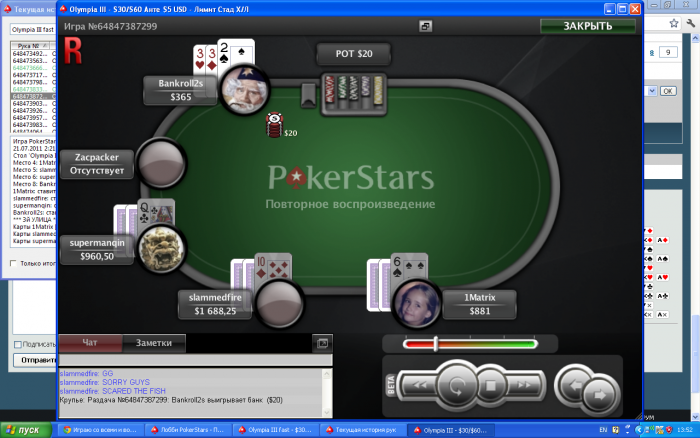 bankroll2s @ 21.7.2011 Впервые залез на 30/60!!! много не играл - поднял 50 долларов и свалил...ну вообще было неприятно, трудновато...Matrix( мы с ним знакомы) сказал мне: bankroll idi spat, za stolom mafia. ...ochen silnyi sostav ну я не мудруствуя лукаво, отыграл 10 рук, пожелал Матриксу удачи и свалил