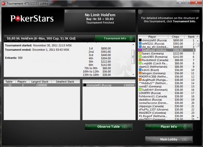 Турниров сыграно - 264.