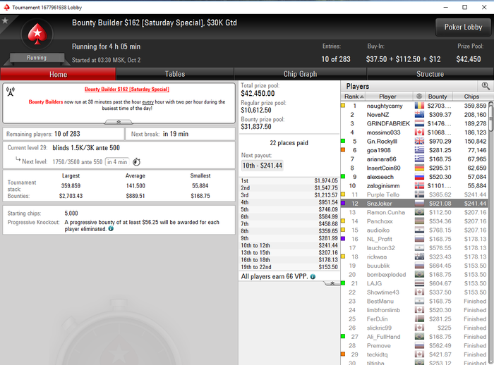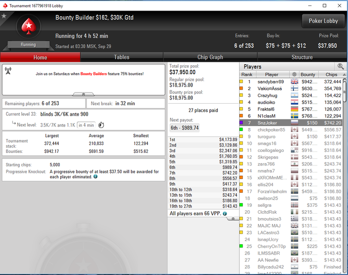 Ну что, сентябрь закончился, можно подвести краткий итог. Для меня он сложился очень плодотворным и в плане игры и в плане подтяния скилла. Много работы во флопзилле, исмайзере, симплпостфлопе, что дало новое видение на большинство спотов. Самым запомнившимся моментом остался воскресник за 530$ на кинге, 211к за первое и всё могло быть по другому, но 88<77 за топ 3 стек в топ 36 и гг =/ На октябрь планы продолжить плотно работать в софте и катать, всем гл и побольше заносов! Общий график за сентябрь :