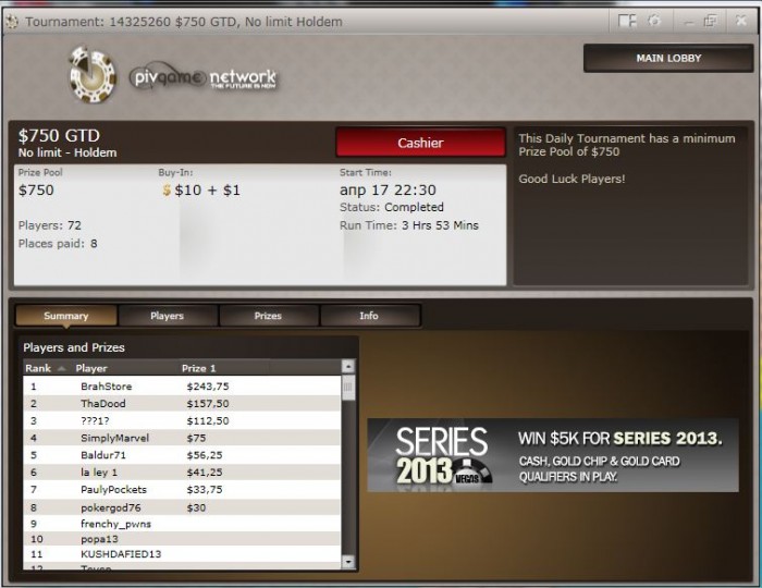 Pacific, $10 Buy-in (150/300 blinds, 30 ante) No Limit Hold'em Tournament, 9 Players