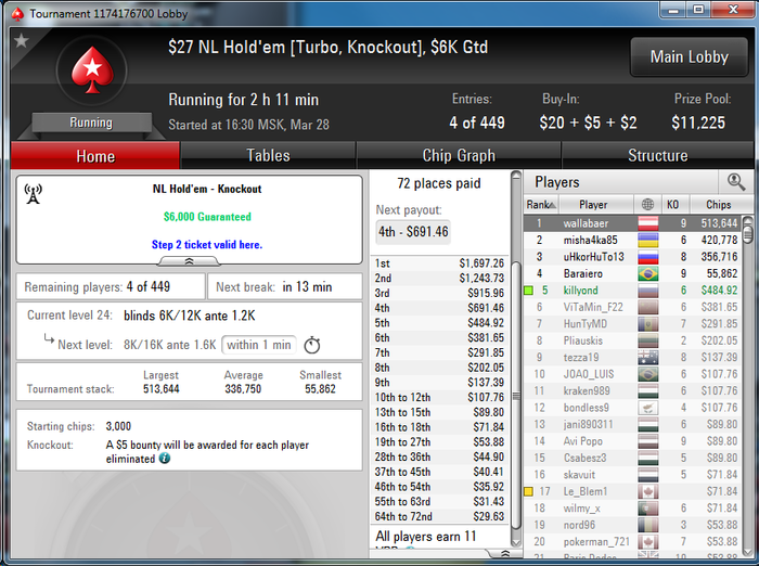 Poker Stars $10+$1 No Limit Hold'em Tournament - t2400/t4800 Blinds + t600 - 8 players