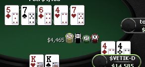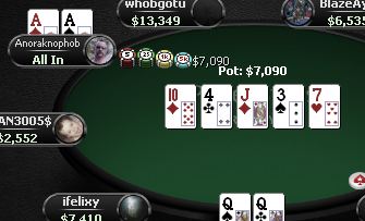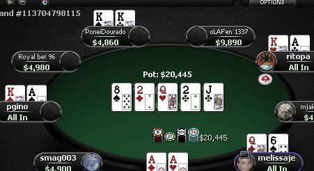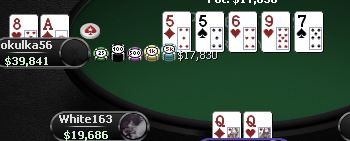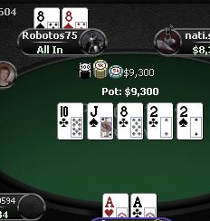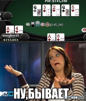 ну только руками развести и списать на то что мол четвёртый час турик идет. устал чувачок. больше никак не обьяснить кол с 10-5, это ж не 22 и даже не задравший всех Кх, это 10-5 бляха-муха. ММ 76, время удваиваться, уже во всю ИТМ, на батоне имеем А9, стол - фолд, изи втыкаем АИ. и так же изи получаем кол. нет, это не бигстэк, и даже не миддл. после кола у оппа меньше ББ остаётся. радуемся? ага. две пары ему. всё правильно сделал. :applause: даже разочарования нет, просто недоумение.
