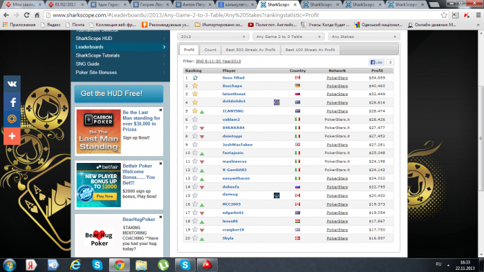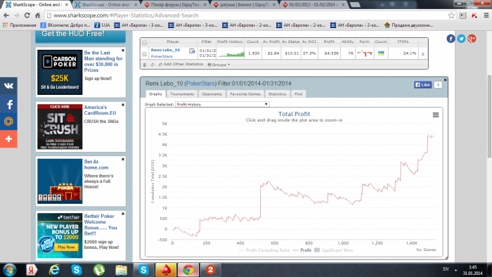 В общем, решил поставить себе более-менее глобальную, но вполне досягаемую цель на 2014 год. Ниже скрин, это лидерборд 2-3 столовых снг за 2013 год, так вот в следующем году хочу вписать туда свой никнейм. В основном буду играть именно 12,18,27,45,180 max. регспиды $7-$15 лимит и выше.18,45,180 max. $15 и выше (По мере развития) Ну и еще мой график в этому году по СНГ турнирам. Хочу добавить, что играл очень не плотно, т.е. много ненужного времени уделял МТТ турнирам, которые у меня вообще не клеятся.