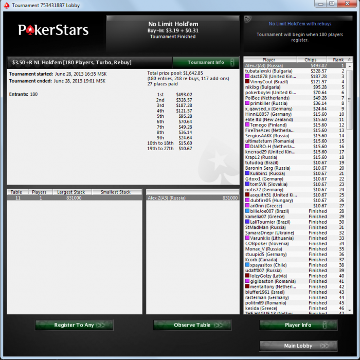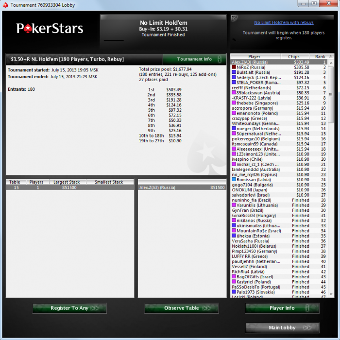 Сегодня играть вообще не хотел т.к устал за весь день и еще на практику вставать надо было, но не удержался запустил одну сесссию небольшую) загрузил 41 турик, в пятнашке 180макс за 2 средних на финалку с ав не устоял против 85 ауты 11ый оставалось несколько столов хотел уже спать ложится, но пару туриков не дали в ребе 180макс 5ый вылетел, ну и недоезд вск)