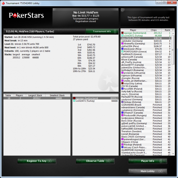 сыграл небольшую 35 туров, в пятнашке 180 6ой в ребайнике по3.5 6ой, и ДВА бабла финалки 10 места по 3.5 збс мог хорошо плюсануть, но пс решил что слишком много будет профита и слишком много подряд плюсовых сессий поэтому так Профит сессии -55$ Общий профит +7116$ Всего турниров 4311