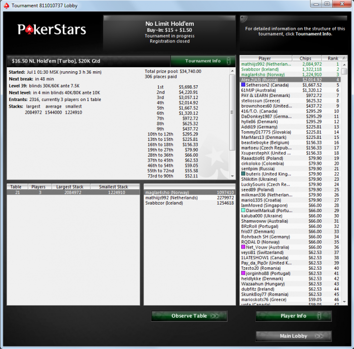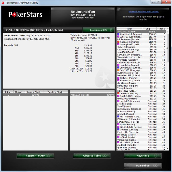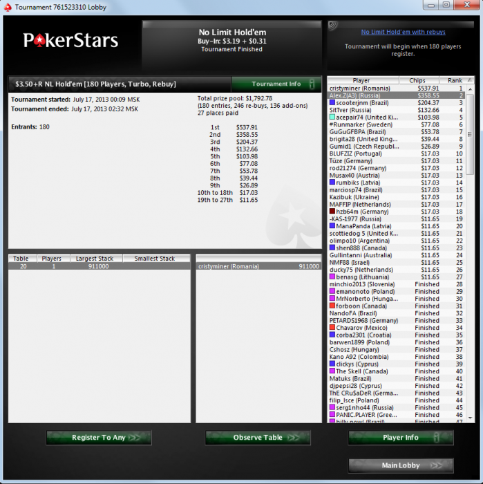 немного жаль конечно с учетом того что несколько раз ребят спасал ривер,иначе давно уже 3макс был вот аут кстати http://www.boomplayer.com/en/poker-hands/Boom/3827592_81761820AA ну и А3 А3 А3 родненькие могли бы устоять конечно и марафон мог закончится)) ну ладно что есть то есть ) будет довольствоваться этим