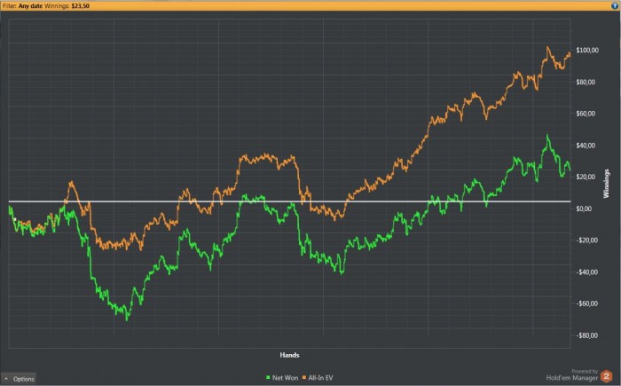Я опять без графиков и отчетов. Одни отрывочные мысли. В общем, решил я уйти из зума, так как на зуме можно заработать, но сложно именно научиться играть, так как этот бесконечный поток комбинаций и противников вбрасывает тебя в подобие транса, где действия совершаются по заведомой схеме. График нл5 зум на 50к рук. По ев 4бб/100. Фактически меньше 1бб/100. Это, я скажу, угнетает. Так что решил кардинально изменить игру.