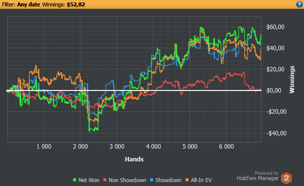 В целом я довольно сильно изменил свою игру и решил одну из глобальных проблем - низкий W$WSF. Со второй (высокий WTSD все хуже). Пока не разберусь и с этим, подниматься на NL10 все же не буду. Да и дистанция после корректировки игры пока не слишком информативна.