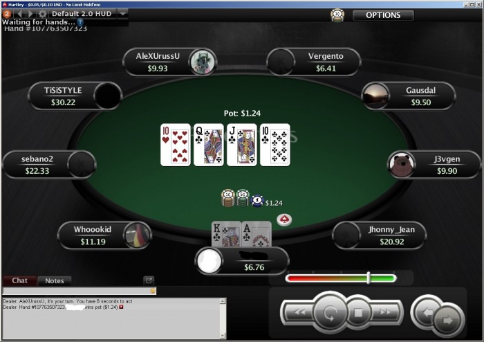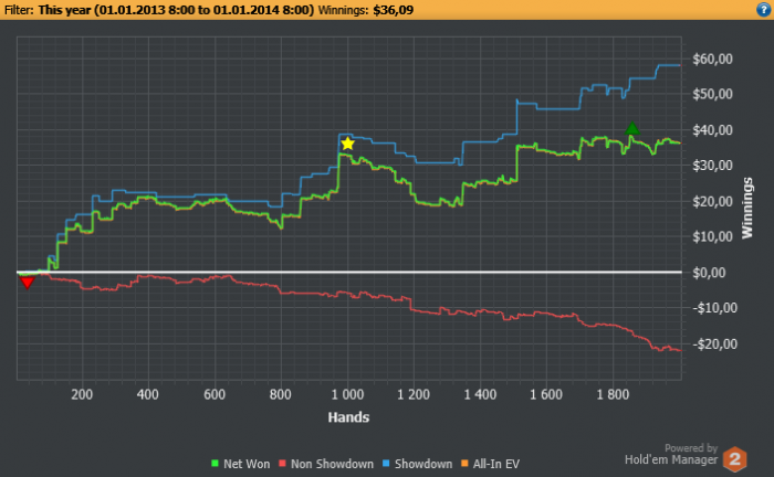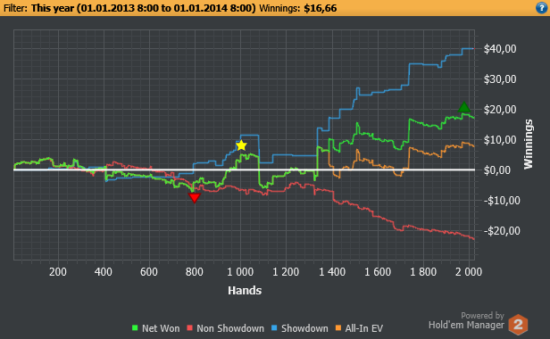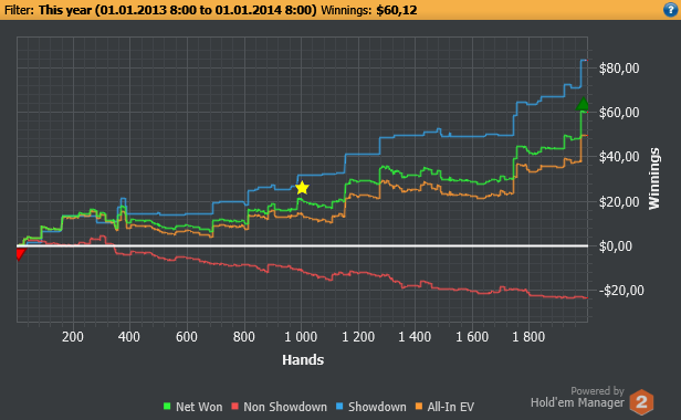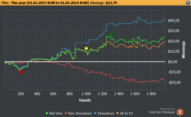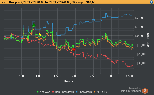 Кароче я устал :) Сидел сегодня до последнего, хотел вывести день в ноль, даже в один момент получилось, поставил галочки сит аут след. бб и за это время слил еще. В итоге дальше хуже. День закончился минусов 1 би. Сегодня конечно творилось много чего, мои блефи вскрывали, рыбам как обычно доезжало на ривере (это больше всего бесит) ну и играл я сегодня "не очень" мягко говоря .