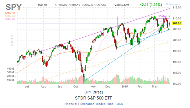 30.3.2015 Теоретическая сессия На теоретической сессии я определяю общее направление рынка (так как я торгую по ходу рынка) и выбираю акции которые могут перекрыть это движение. На момент закрытия биржи в пятницу SPY был 205 и по графику даже finviz указывал на то, что SPY был на уровне поддержки.