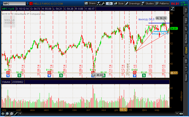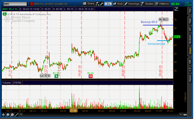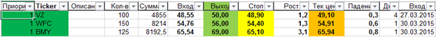 Update после сессии 30.3.2015: SPY уже на premarket дал +0.7% и уже на маркете дает +1,22%. Все акции пошли в нужную сторону, поэтому оценка подтверждается. С открытия рынка смог войти в 2 обозначенные акции WFC, BMY, в VZ купил в конце прошлой сессии. До результата еще ни одна не дошла, но стопы я уже передвинул вверх, даже некоторые в безубыточное положение. К несчастью я переборщил с размерами лотов и одну сделку мне автоматически закрыл брокер за 15 минут до конца сессии - зато плюсовую anyway: