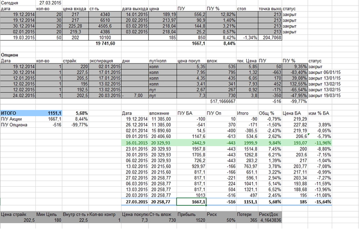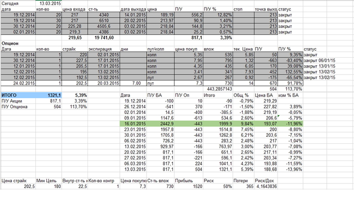 Анализ позиции. Анализируя ведение позиции по данной сделке, обнаружил, что акция просела почти на 14% с тех пор , когда я начал ее «шортить» с 19/12/14 , однако моя позиция дает прибыль в целом только в 5,39%, то есть в 2,6 раза меньше по сравнению с 14%. Это значит , что есть ошибки. Ошибка связаны как я вижу с боязнью соблюдать свой план и с не открытием позиции по акциям, когда была возможность, даже через режим «locate», когда акция не была доступна для короткой продажи в обычном режиме (через терминал). Отсюда разница между процентом прибыли и чистым движением вниз по акции. Либо тогда нужно брать больше кол-во опционов пут……….., да, есть над чем подумать.