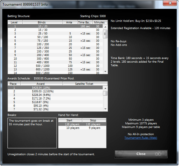 Volkoff_V_A @ 27.4.2014 До бабла игра шла 5.5 часов А вылетел на 66-м месте с < спустя ровно 7 часов игры. Турнир мне понравился, но играть наверно и я его больше не буду из-за его продолжительности