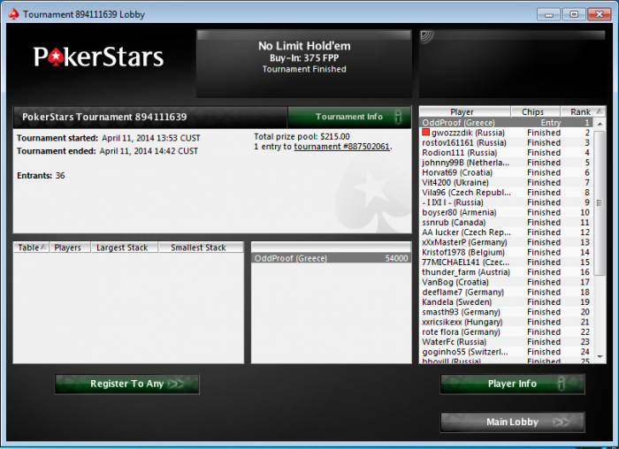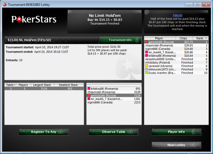 Poker Stars, $1.35 Buy-in (50/100 blinds) No Limit Hold'em Tournament, 9 Players