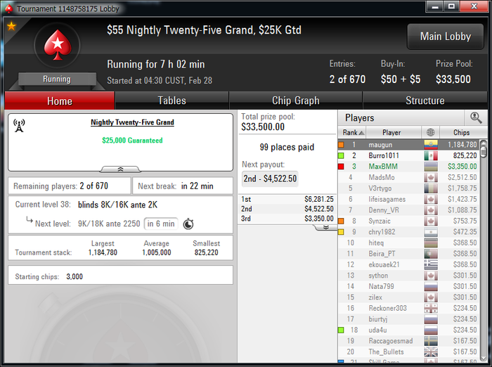 не получилось не поиграть день-два Подгрузил 5 турниров "под чай", в Найтли25Гранд сел на лейтрегу.Когда оставалось 2 стола, вышел доиграть на улицу возле бассейна. В 109турбо слетел 18ым(15итм, ДД в А6). А в Найтли получилось зацепиться. Когда нас осталось трое, за минут 15 до перерыва на ноуте оставалось 10% на батарее. Ну думаю, успеюИ когда уже было 15:54минуты, у меня гаснет монитор, когда я уже нажал кол в этой раздаче на флопе http://www.boomplayer.com/en/poker-hands/Boom/13232278_A852D4EB67 Раздача против отбитого на всю голову фиша, планировал не выкидывать тут против него. Быстро бегу в дом, подключаю зарядку, включаю ноут, а на ПС я почему-то дисконнектед, жду до 25секунд таймбанка в надежде, что щас подключусь, но не включается. Перезагружаю ПС и на последних секундах успеваю поставить олл-ин Уже было 16:00 по местному, когда я это сделал и только начался перерыв. Жаль, мне это не помогло и я всеравно ушел 3им, хотя нажил много фишек у фиша, но потом ему же их и отдал. А с топ2 мог бы и бестмансеве оформить