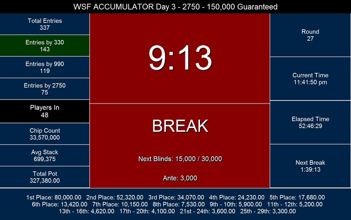 [attachment=259794:image.jpg]Близок к завершению второй день главного события WSF Poker Tour в Кишиневе. Сегодня бай-ин в 990 лей внесли 119 игроков, таким образом призовой фонд WSF Accumulator вплотную приблизился к заявленной гарантии в 150,000 лей. При этом завтра нас ожидает еще один (последний) входной день в WSF Accumulator – стек в размере 300 тысяч фишек получат игроки, вступающие в борьбу с третьего дня турнира. Напоминаем, что бай-ин для третьего дня составит 2750 лей, а поздняя регистрация будет доступна первые четыре уровня. Уже завтра в упорной борьбе определятся призеры WSF Accumulator, а имя Чемпиона первого «выездного» этапа серии будет навсегда вписано в историю WSF Poker Tour!