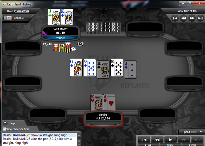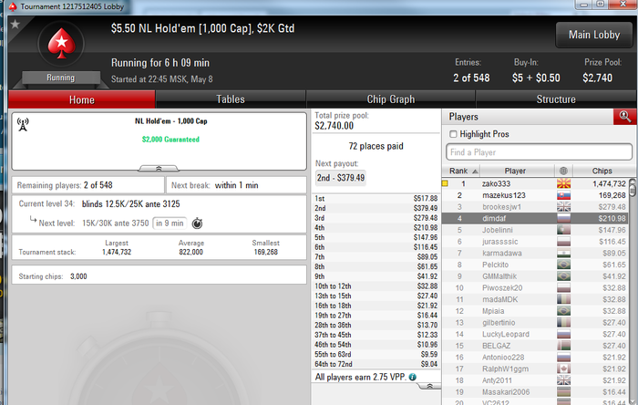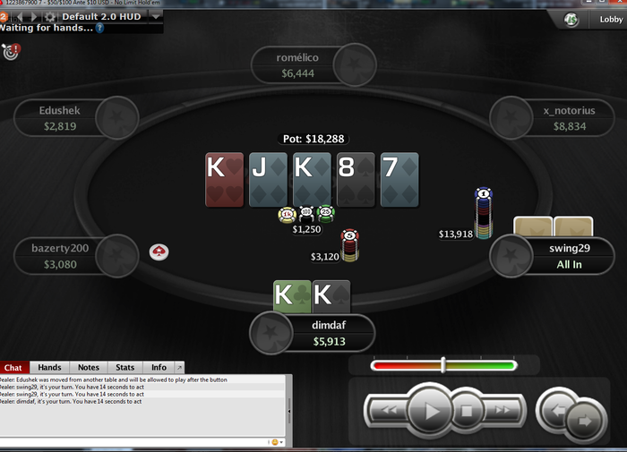 Так, проверил руку в ХР. Выставление было бы плюсовым с руками вида 88+,АТs+.AQo+. Против одного оппа тоже не стоило выставляться с 66. Вот так вот..
