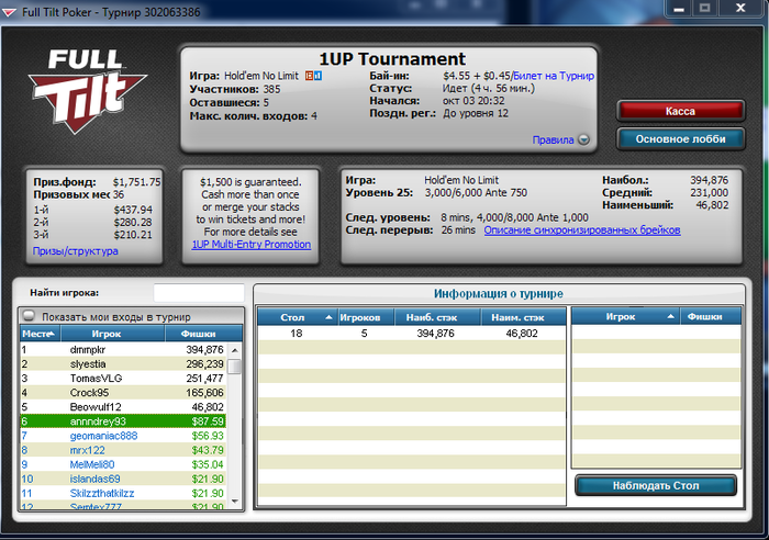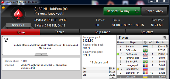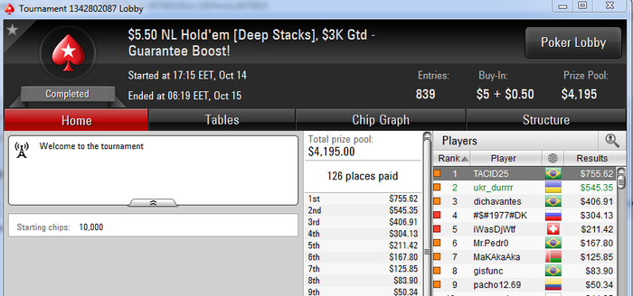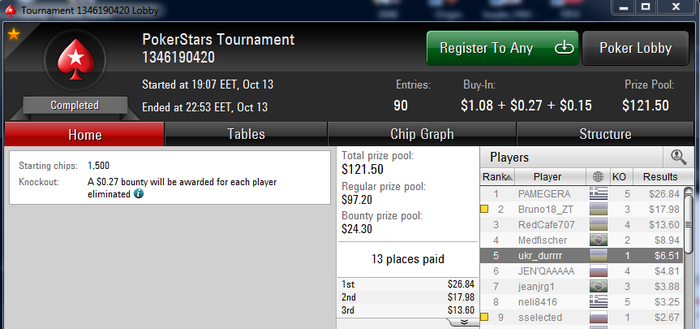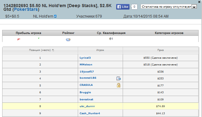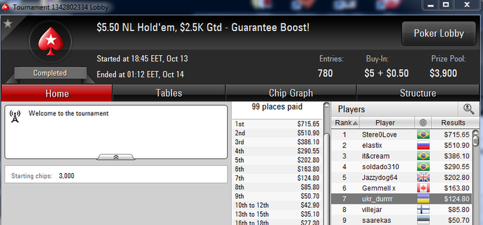 ukr_durrrr @ 15.10.2015 Falmera, учти что турнир идет 10-13 часов. Терпения хватит? читал я твои нит посты о переездах на снг $0.25. тут можно просидеть 8-9 часов, вылететь 12-10-м и получить за это 8 би. Возьми себе на заметку