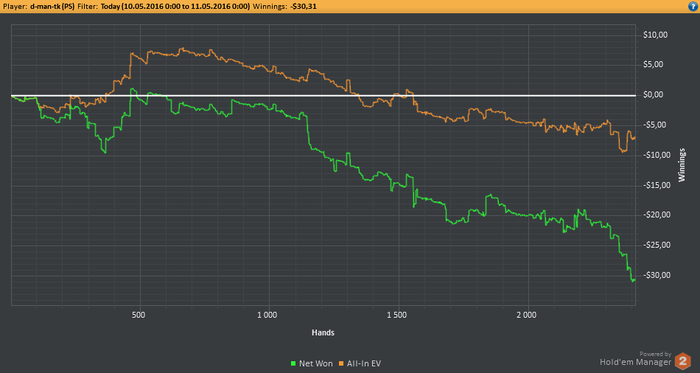 manoflols, Какая-то у тебя обратная логика. Если оппонент не левелит, то инста чек по риверу означает как раз руку средней силы, с которой он и не думал не вельюбетить не блефовать. Но это на самом деле лирика. Какие бы там ни были тайминг теллзы - не ставить на такой руке в этом споте криминально.