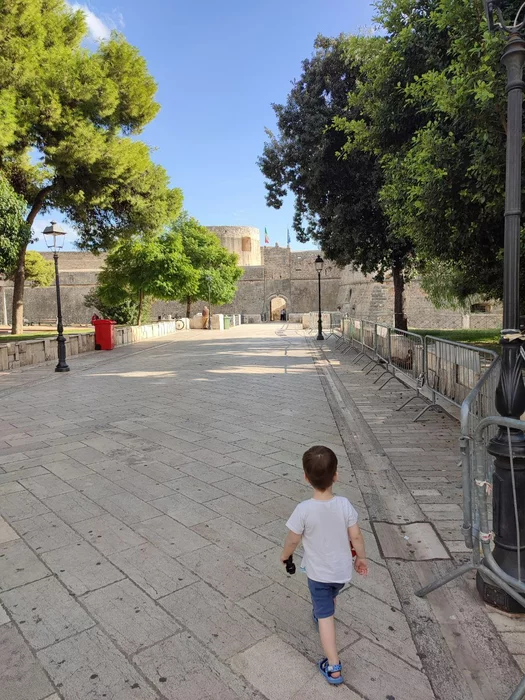 Спустя пару дней сидения дома, мы поехали фулл составом в Манфредонию, городок на берегу моря в 100км к северу от нас. Как только мы вышли из автобуса, я начал бегать за сыном, а жена пыталась понять как выйти к морю. Море было немного грязным, я чуть замочил ноги с сыном, в то время как жена с тещей искали где бы подкрепиться.