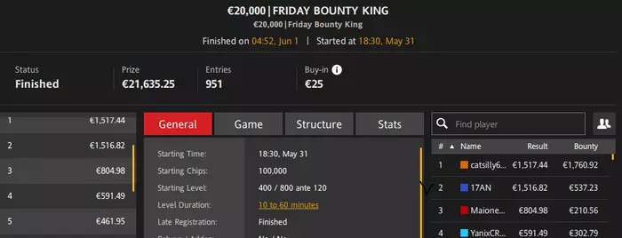 🥈 Андрей 17AN занял второе место в Friday Bounty King. Наградой стали призовые €2,053.