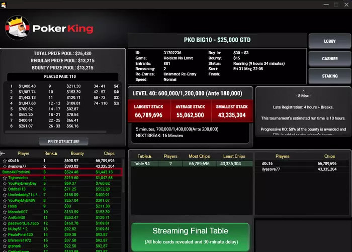 🥉 Отметим также занос Виктора KRUG. Он тащил PKO BIG10 на PokerKing и занял третье место в турнире. Призовые вместе с баунти составили $1,967.