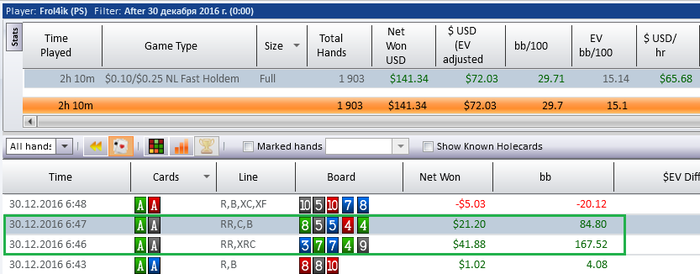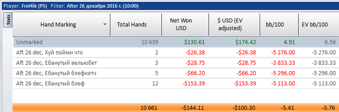 Короче проаналил помеченные раздачи, нашел ошибок на 167.62$(чистыми). Спорные ситуации игнорировал. Ну, как можно догадаться по скрину, основные утечки в блефах. Я просто слетел с катушек и начал агриться на всех регов подряд. И даже на фишей. В CUBABRAZIL27 1.5 стека отгрузил по А хай. Такое дерьмо я делаю даже реже чем 1 раз в месяц.