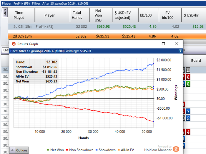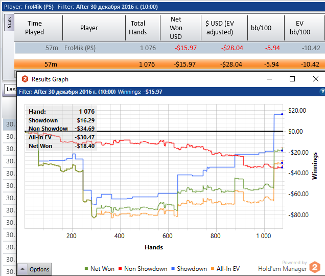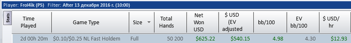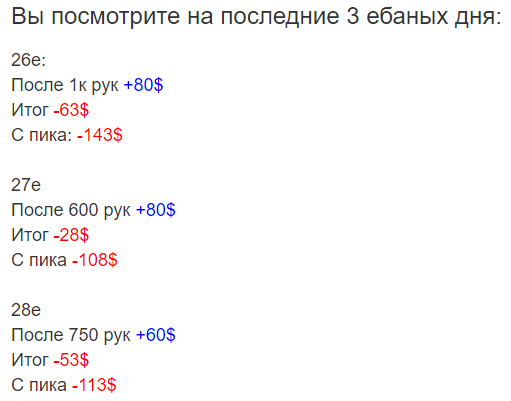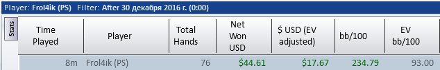 Просто нужно делать выходные и эмоционально разряжаться, к компу 1-2 дня вообще не подходить. Тогда не будет таких срывов. В моем случае это не трагедия, конечно. Что касается плюсовых раздач, там никто не верит в моим сеты/флеши/фуллы и радостно оплачивают. Я прекрасно понимаю, что в высокое втсд блефовать бесполезно, QJs запихивал в 34% втсд. Но там конченая мразь, таких хочется бить ногами. Я наверное представлял, что пиздию его, когда ставил.