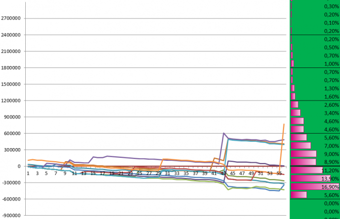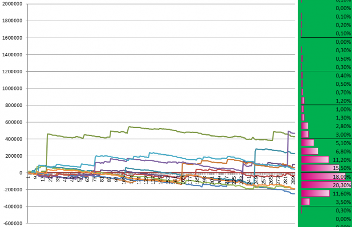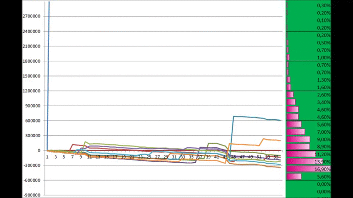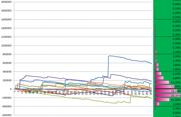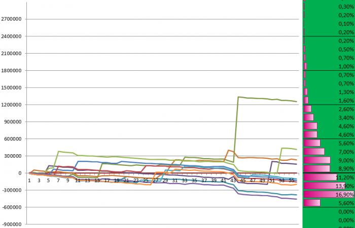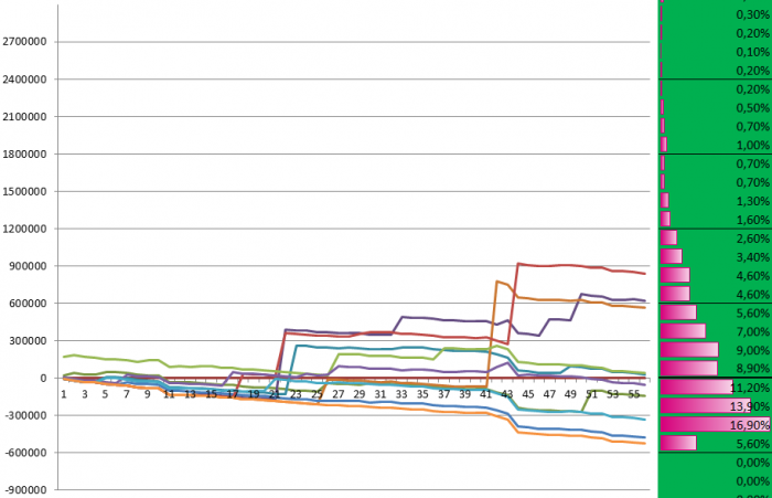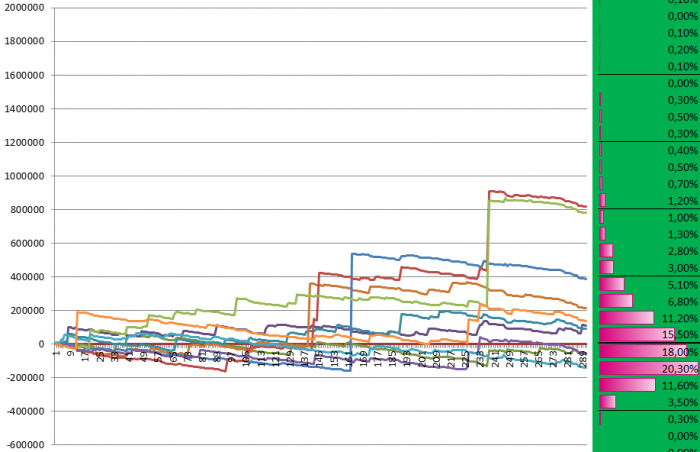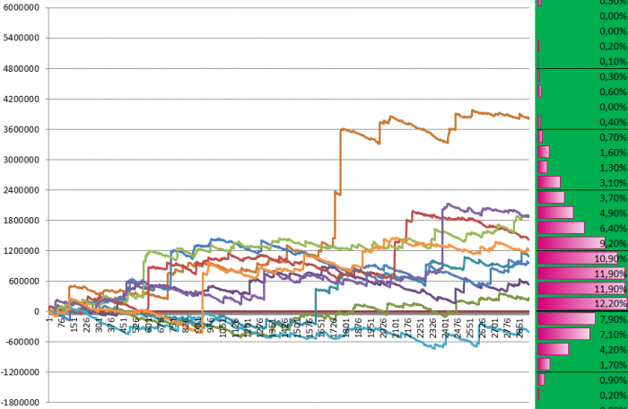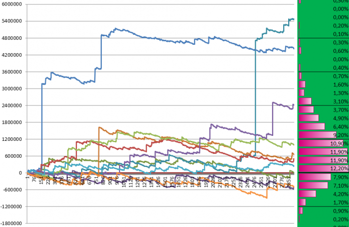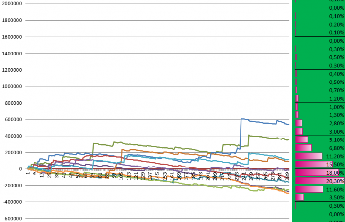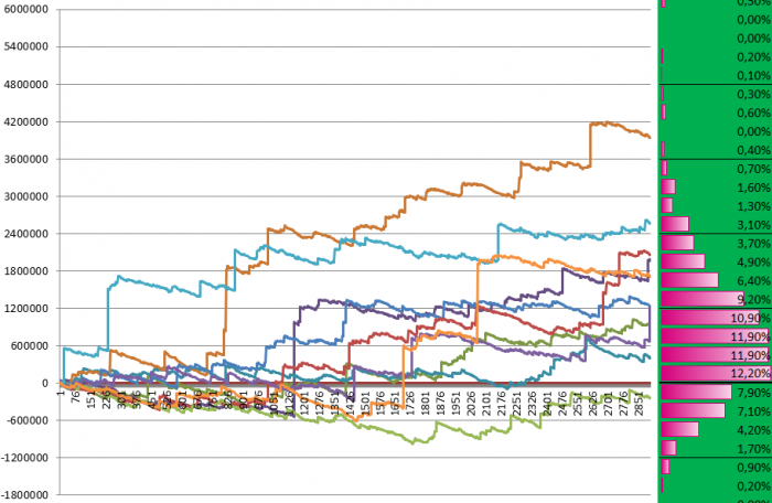 Оказывается, несмотря на всю нашу плюсовость, вероятность того, что мы закончим год в минусе, составляет 53%. Противоречий тут нет. Из-за специфики призовых выплат в турнирах мы чаще проигрываем, но помалу, а если выигрываем, то сразу много. Больше 600к мы не проиграем, а вот выиграть целых пару лямов – как нефиг делать.
