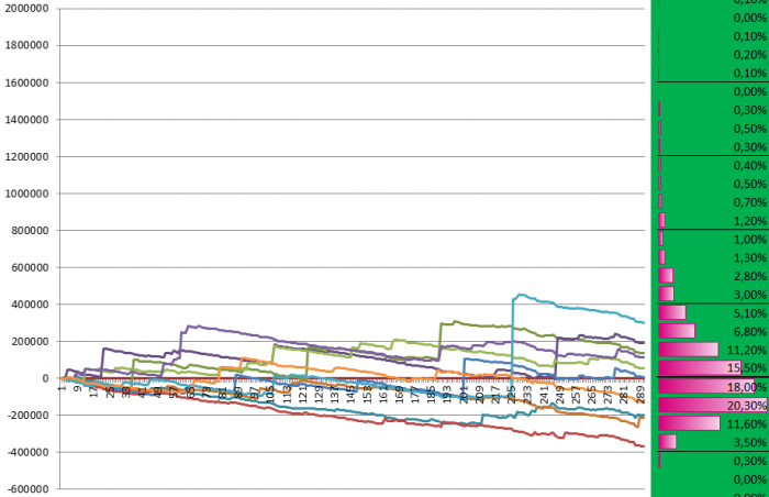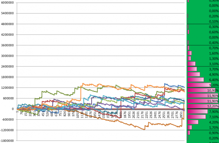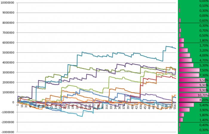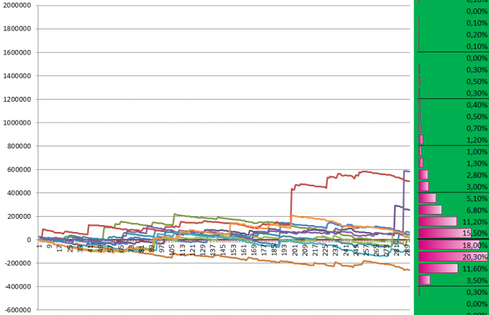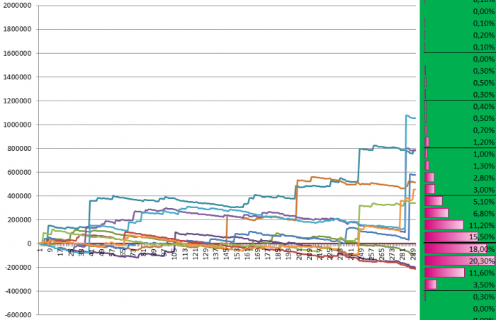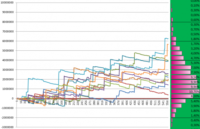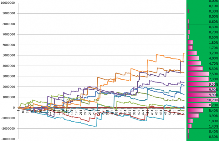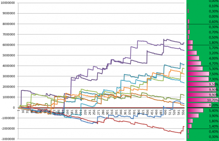 Интересное распределение у него. Вероятней всего, он будет в минусе 300-400к (загрузка за год 530K), но зато хвост у распределения длинный и звездный.