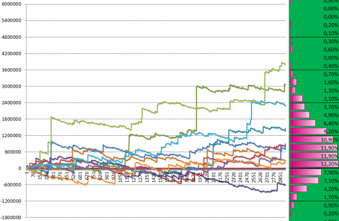 На графиках – множество годовых результатов десяти абсолютно одинаковых гриндеров, играющих наши турниры.