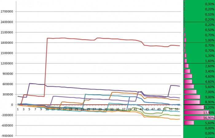 Интересный нюанс – неплавное распределение. Но если вспомнить, что в графике Негриану есть турнир за 100к на 29 человек (призовые в нашей модели согласно таблице будут 50-30-20), то это объяснит «шероховатости» распределения.