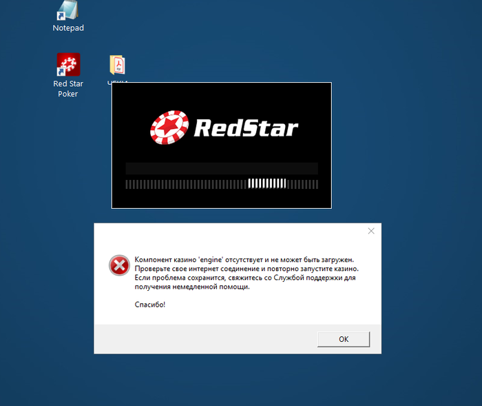 P.S. Нашел способ как заставить его работать. Заходите на сайт редстара, там нажимаем "Загрузить", качаем клиент(без трехбуквенного сочетания не скачается, т.к. он хостится видимо на каком-нибудь сраном Cloudflare). Дальше переустанавливаете клиент - вуаля, все работает.