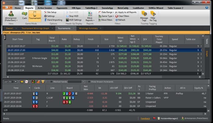 Здравствуйте! у меня проблема с графиками, что-то не то, возможно много дубликатов рук(как мне посоветовали в др.ветке). Далее я экспортировал все руки в папку. удалил базу через purge. потом импортировал обратно из папки. Количество рук сократилось на 20 тыс. но графики такие же Так же не помню когда это я выигрывал 900 баксов в турнире за 44$, такого не было, а в списке он есть