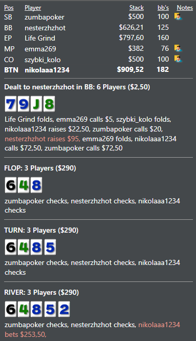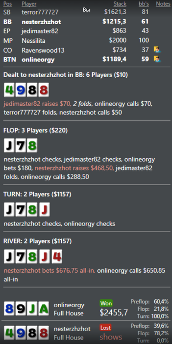 Собственно, нюанс состоит в том, что ты при разборе будешь видеть отклонения у своих оппонентов типа "должно быть 50%, а у него 85%", а я вижу отклонения в виде "у него тут должно быть 50%, на деле 54%", что ничего особо не дает. Поэтому, чтобы найти, где оппонент играет "не так", мне нужно просматривать конкретные раздачи (именно так просидел над Скаттефаром часов 5, смотрели с коллегой раздачи с ШД). И вот вчера сидел над Фьюттеком часа 2, и понял, что его игра пока что самая стройная из всех, что я смотрел (особенно, в сравнении с Кобусом и Скаттом). Именно поэтому я и написал, что на текущий момент Фьюттек произвел на меня наибольшее впечатление