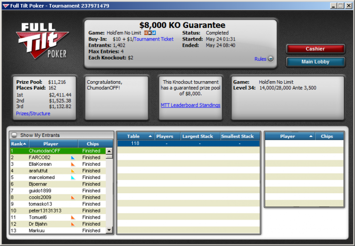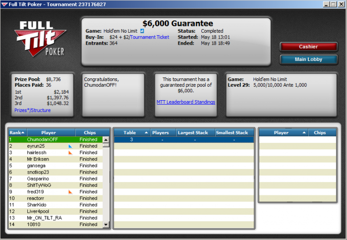 Вернулся из Вытегры (Вологодская область), где отдыхал неделю. Чуть позже выложу фото-отчет. С 13 по 19 июня планирую сыграть серию на Кипре, Merit Poker Series Summer Open, на которую продаю доли здесь Ну а до Кипра буду много катать онлайн.