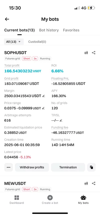 Я тебя просил скинь любые настройки бота, чтобы я понимал от чего плясать. Ты зажал. Пришлось методом научного тыка, "вслепую" выбирать настройки. В результате и лот вышел намного больше, чем хотелось и цена ликвидации намного ближе, чем хотелось. При текущей цене HOME в 0.030 в описании бота показывало, что цена ликвидации 0.055. Я думал этого достаточно. Но в реале вышло сразу после 0.040 ликвидация. Похоже бот не учитывает, те ордера которые будут открываться при росте цены. И при создании он выбирает такой размер лота, чтобы акурат хватило для создание всей сетки и в таком случае ликвидация будет сразу выше последнего уровня сетки. Меня такое не устраивает. Похоже, при изолированной марже, нужно после создания сетки, вручную добавить маржи, чтобы цена ликвидации поднялась выше.