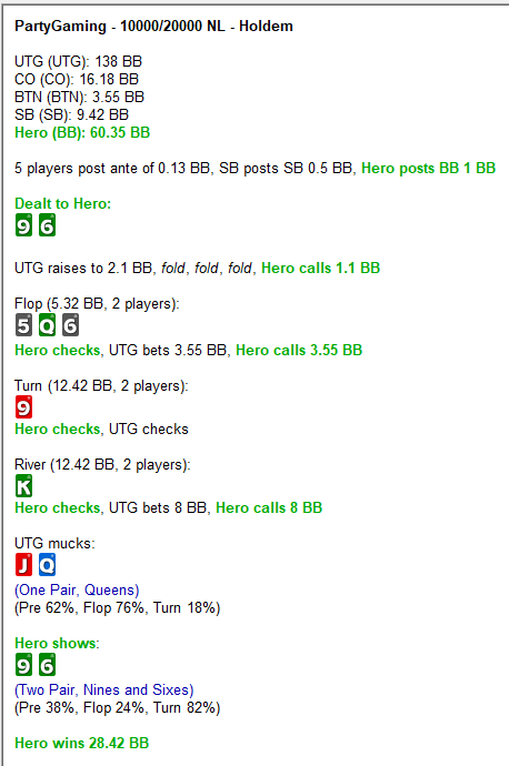 Похоже на колл. Из реальных рук оппа: сеты, в9, д10 которые нас бьют. Остальных рук, что нам платят, намного больше. И не стоит недооценивать тот факт, что чипак будет излишне продавливать этот спот из за чудовищного ицм давления на тебя.