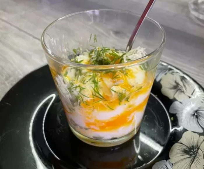 Берём кружку или стакан, кладём туда кусок сливочного масла, солим, перчим. Варим 2-3 яйца 4 минуты. Несколько секунд охлаждаем в холодной воде, быстро чистим, пока не остыли. Кладём в кружку с маслом и размешиваем. Можно добавить сыр, зелень.