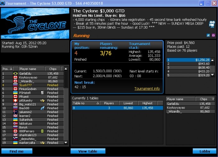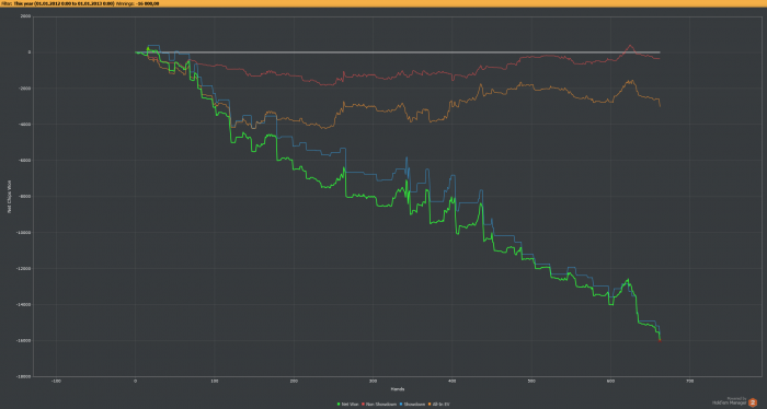6 турниров от шутаута до нокаута за 6 и 11$ 5 итм 2 финалки 5-е и 2-е и всего 140$ призовых, в конце ядерные фиши повключали режим бога и досвидания как говорится. Я обожаю покер , но больно то как когда несколько дней подряд по тебе прокатываются как танком, апстрик не за горами, но видимо уже через месяц, через пару дней на работу поеду, ломает конечно особенно после отпуска в 2 месяца, но покером пока много не заработал чтобы бросить работу, да и не собираюсь я зарабатывать покером, хотя если втащить СМ то можно подумать о жизни как рантье на проценты или еще чего.