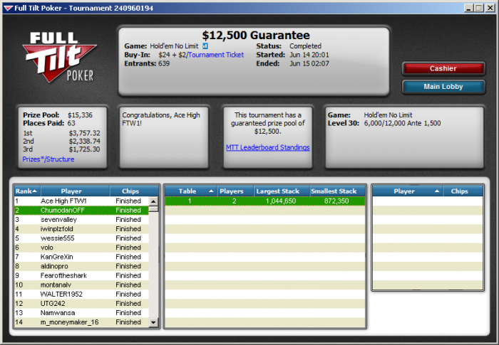 15.06.2011(20.00) – Фризаут с глубокими стеками 1100$ (2х дневный турнир)Стартовый стек 10К, блайнды по 40 мин. На первом же уровне 25/50, в самом начале я удвоился: русский фишеватый дядя рейз 175, за ним фиш кол, я 675 с