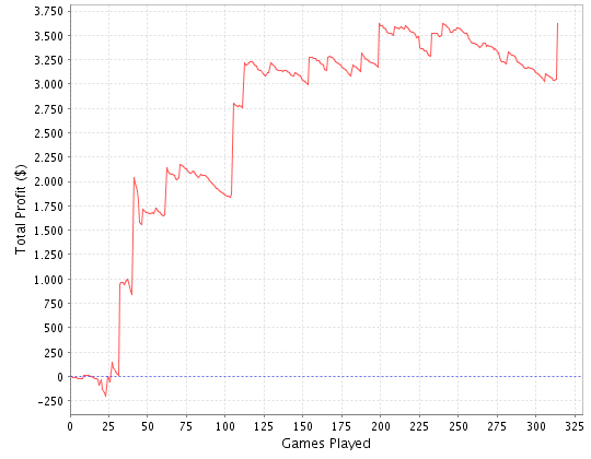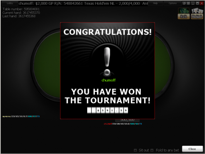 Во втором раунде мне достался русский мужик лет 40, жесткий фиш. Он рейзил 5х-сайзингом почти каждую руку, а 3бетил 4х. И колил все рейзы и 3беты.