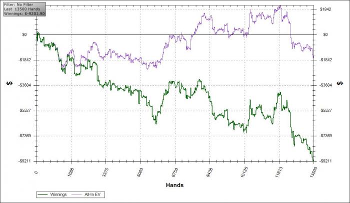 Он же, как показала оценки этой раздачи, в принципе не понимает, как в этой ситуации можно играть чек/колл (хотя, опять же, у меня в руках топ-рейнджа блефкатча, потому что я бью даже четыре флеша, которые он может ставить на руках типа